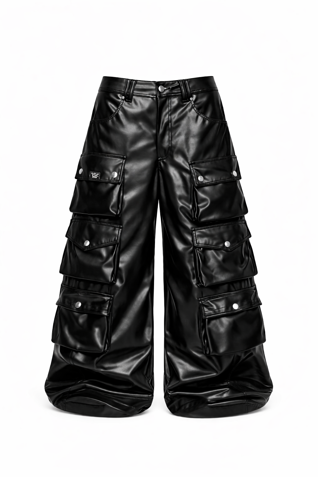 Calça cargo de couro com 12 bolsos, cordão na cintura para ajustar (por dentro).
